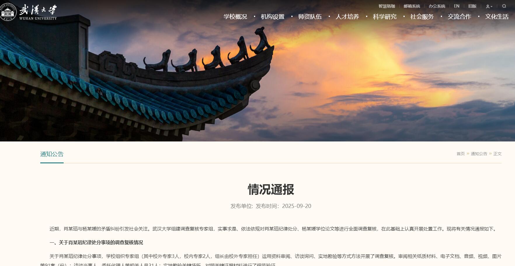 中国新闻服务,9月20日。根据武汉大学的官方网站,肖·穆奇(Xiao Moucheng)和杨·穆尤恩(Yang Mouyuan)最近的冲突和冲突引起了社会关注。武汉大学成立了一组研究和审查专家,对肖·穆奇(Xiao Moucheng)的文件和杨穆尤恩(Yang Mouyuan)的文件进行了详尽的调查和审查,并基于这一点认真地进行了消除工作。报告相关情况如下:1。关于对小穆奇的纪律行动问题的研究和审查,关于Xiao Moucheng的纪律处分问题,学校组织了一群专家(包括校园外的三名专家和校园内的两名专家,以及包括LGROUP IDERES的两名专家(包括Lgroup Ideers Campus),营地包括了两名专家)使用数据评论和其他方法进行研究和审查。审查了一组91种相关纸质材料,电子文档,音频,视频,照片等。采访了二十名相关人员,并进行了委托的代理商和其他相关人员。在该地点检查了重要的位置,并根据重要证据进行了详细的验证。 2025年9月17日,湖北省的中间人法院决定决定第二阶段对杨穆尤恩(Yang Muyuuan)的性骚扰和损害案件,并支持第一个会议厅的决定(7月25日,在Uhan经济和技术开发区的受欢迎的法院拒绝了乌汉(Uhan)的所有要求)。基于完全尊重司法审判并结合调查的原则,学校决定取消Xiao Moucheng的范围。 2。Yang Mu Yuan的研究和评论文章:Yang Mu Yuan’精通论文是“对中国和印度家庭暴力影响的经济分析”。 2024年4月,学校派遣了相关机构进行学术不当行为的测试,总文本复制为1.9%。并且文本符合大学的要求,在该大学中,全文和每个段落的重复率少于10%,并且文本中的文本为文本的重复率不到30%的文献中的文献。 4月,三名专家被派往校园外进行“双盲”审查(作者的身份信息,导师和评论专家被隐藏了,并且都是匿名的匿名者),三位专家同意了辩方。 5月,硕士论文国防委员会的五名专家投票赞成Yan Mu Yuan的硕士学位奖。经济与经济学学院的评估小组委员会投票授予Yang Mu Yuan硕士学位。 6月,学校评估委员会审查并投票授予Yan Mu Yuan的硕士学位。在2025年8月出现公众舆论之后,学校组织了专家调查和审查Yang Mu Yuan Master论文。这分为两个阶段。在第一阶段,在校园内组织了17对专家,将他们分为5组,通过一个人组织以确认在线问题并整体审查文件。在第二阶段,根据初步工作成立了一群专家(总共五名,包括校园外三名专家和校园的两名专家,小组领导人被带到校园外的专家)。作者使用文件审查,纸质评论,数据比较,复制验证和其他方法专注于Iung Mu Yuan的论文和大师标题,并根据纸张问题,工作程序,研究方法和结论,写作标准等的选择来授予。经过验证,专家小组是他认为,穆尤恩主题论文的主题是创新的,测量方法基本上是适当的,并且参考回归的结论与模型的假设基本一致。我们可以证明该文档中使用的190,000个原始数据。单个图形复制的结果与原始文本不同,但并不影响文档的主要结论。找不到任何学术行为,例如窃,主观欺诈,数据操纵,结论等。同时,专家们进行了审查,杨·穆尤恩(Yang Mouyuan)的文章具有100多种不规则性,主要是不规则的代表,不规则的任命,不规则形式,不准确的翻译和不准确的划分。我们发现它的重点是分析。 2025年8月,学校举行了学位评估委员会会议。他决定维持根据研究授予硕士学位的决议审查,并根据适用的“中国共和国的年级法规”以及与武汉大学裁决有关的法规。杨穆尤恩(Yang Mouyuan)的“双盲”纸张专家说,“纸质写作的标准化存在许多问题”,并建议它进行了纠正。国防委员会还提出了审查的建议,但是杨元元本人只进行了部分审查,主管对该文件没有严格的控制权,并且对经济学和工商管理学院评估的小组委员会并未严格考虑该文件。 3。根据调查结果,决定要求对相关人员和部队提起诉讼:“关于中国共产党的纪律行动的法规”,“关于中国共产党的责任的法规”,“针对研究生福音士监事会会议的行为守则”ittee”。而不是细节,学生的管理并不是一丝不苟,学生管理工作并不一丝,造成了负面影响。当时,党委员会学生事务部长李负责对外国语言学院的本科教育的管理,并给予了党委员会委员会委员会委员会委员会的委员会,该委员会的委员会委员会和该委员会的委员会。党委员会的委员会负责外国语言和文学学校的工作管理,以进行书面检查并进行实际审查。Ment School,没有履行其经济责任。警告了穆奎明。经济学和管理学院的学位评估小组委员会不遵守质量审查和论文管理的主要责任,被命令进行书面检查并进行实际审查。经济与管理学院党委员会不符合教育和能力的知识责任的责任,并收到了进行书面检查并进行实际审查的命令。有传言说“杨元的论文被认为是一篇很棒的文章”。经过验证后,乌汉大学(University of Uhan)在2024年没有选择杰出的掌握论文。“武汉大学(Wuhan University)有传言说杨·穆伊(Yang Mui)同意审查他的老师的工作。” Vinagre。验证后,要进行纸质审查,学校要求杨元元为文档提供原始数据和代码,但文档中没有更改。有传言说,小穆奇“面对导致其学术中断的网络暴力”。经过验证后,小穆奇(Moucheng)通常参加了教育和教育活动,他们的学业成绩并未中断。在与相关方进行了验证后,有传言说:“来自乌汉大学的毕业生要求撤销惩罚,并发起了一封联合信以对学术欺诈行为”,“ Yang Mu Yuan的叔叔是Uhan大学科学院和科学院学院的学者”。以及邓穆莫(Deng Moumou)和其他虚假信息的合作文件
