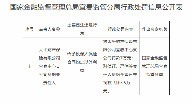 中国经济网络北京,9月15日。昨天,国家金融监督政府网站宣布披露Yichun主管部门的行政罚款。 Taiping Property Insurance Co.,Ltd. Yichun Central分支机构和相关官员犯下了以下非法和不规则行为:它提供了超出保险合同以外的保证福利。州监督和金融管理局的Yichun监督部门是Taiping Property Insurance Co.,Ltd。然后,他警告Fu Yu,Yan Qiao和其他官员,总共罚款35,000元。原始文本如下所示。